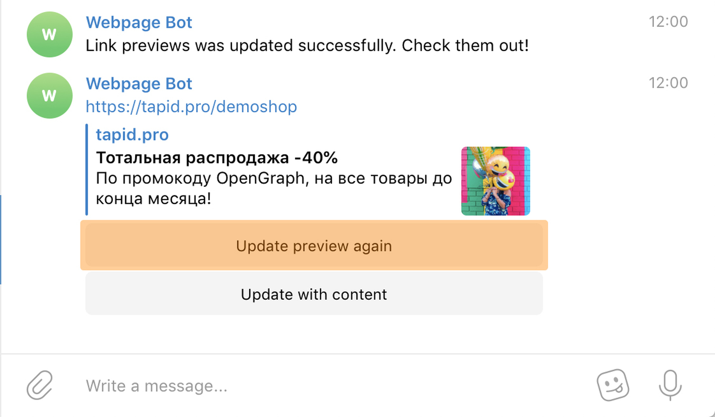 - Нажмите в ответном от бота сообщении кнопку Update preview again
