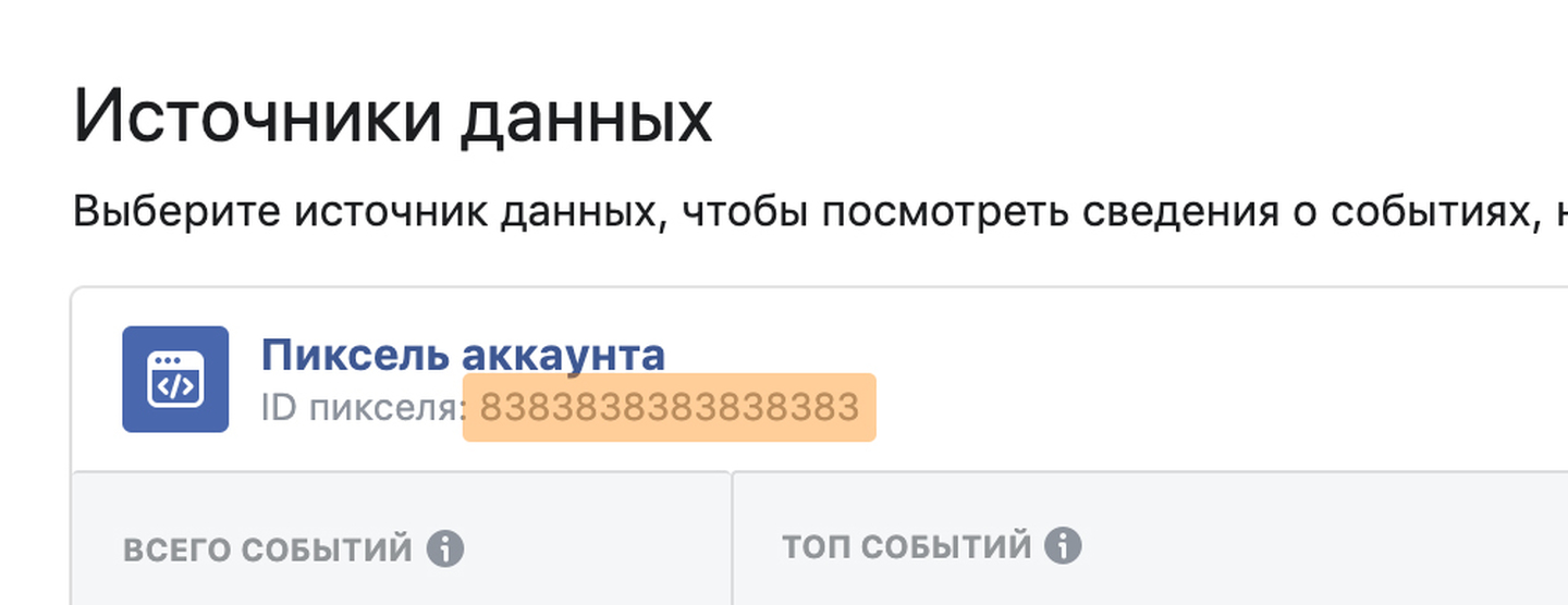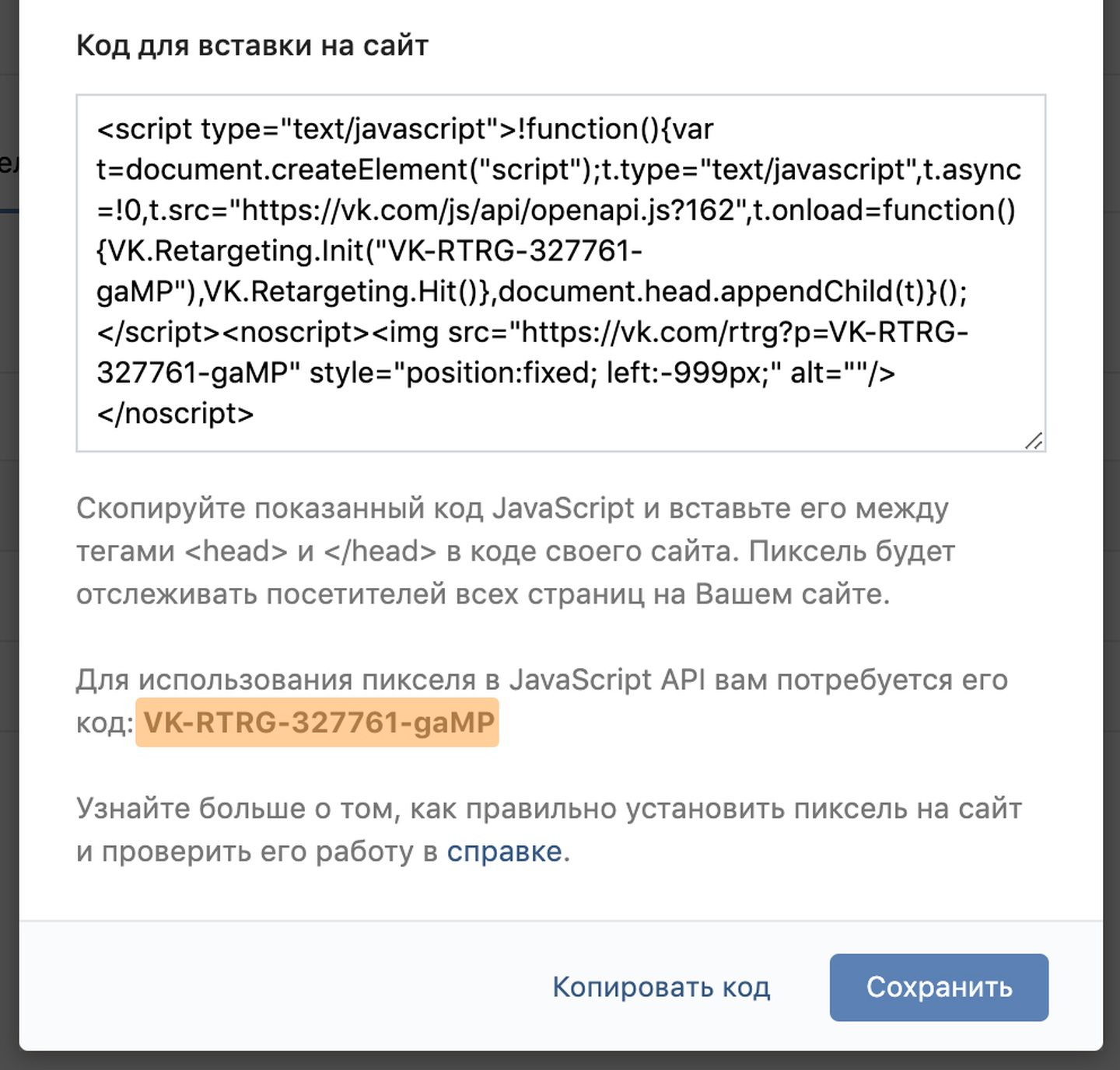 - Откроется новое окно. Скопируйте код пикселя из указанного на скриншоте места: