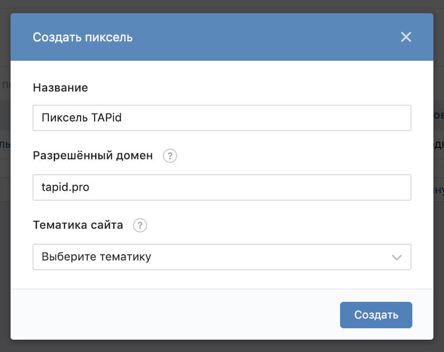 - В открывшемся окне введите название пикселя, укажите домен tapid.pro (в случае если вы подключили собственный домен — указывайте его), выберите тематику.