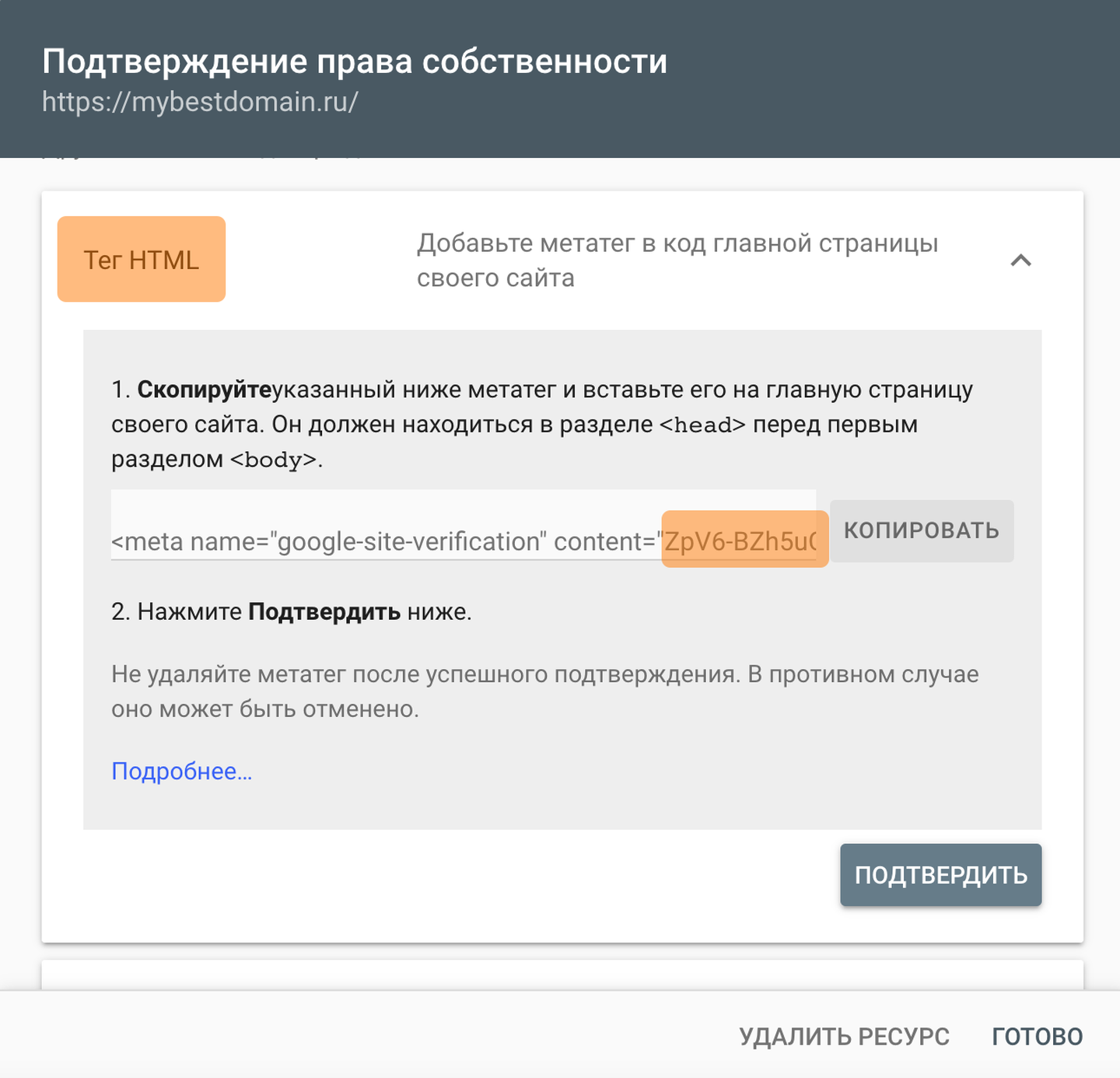 Вернитесь в Google Search Console и нажмите кнопку Подтвердить.