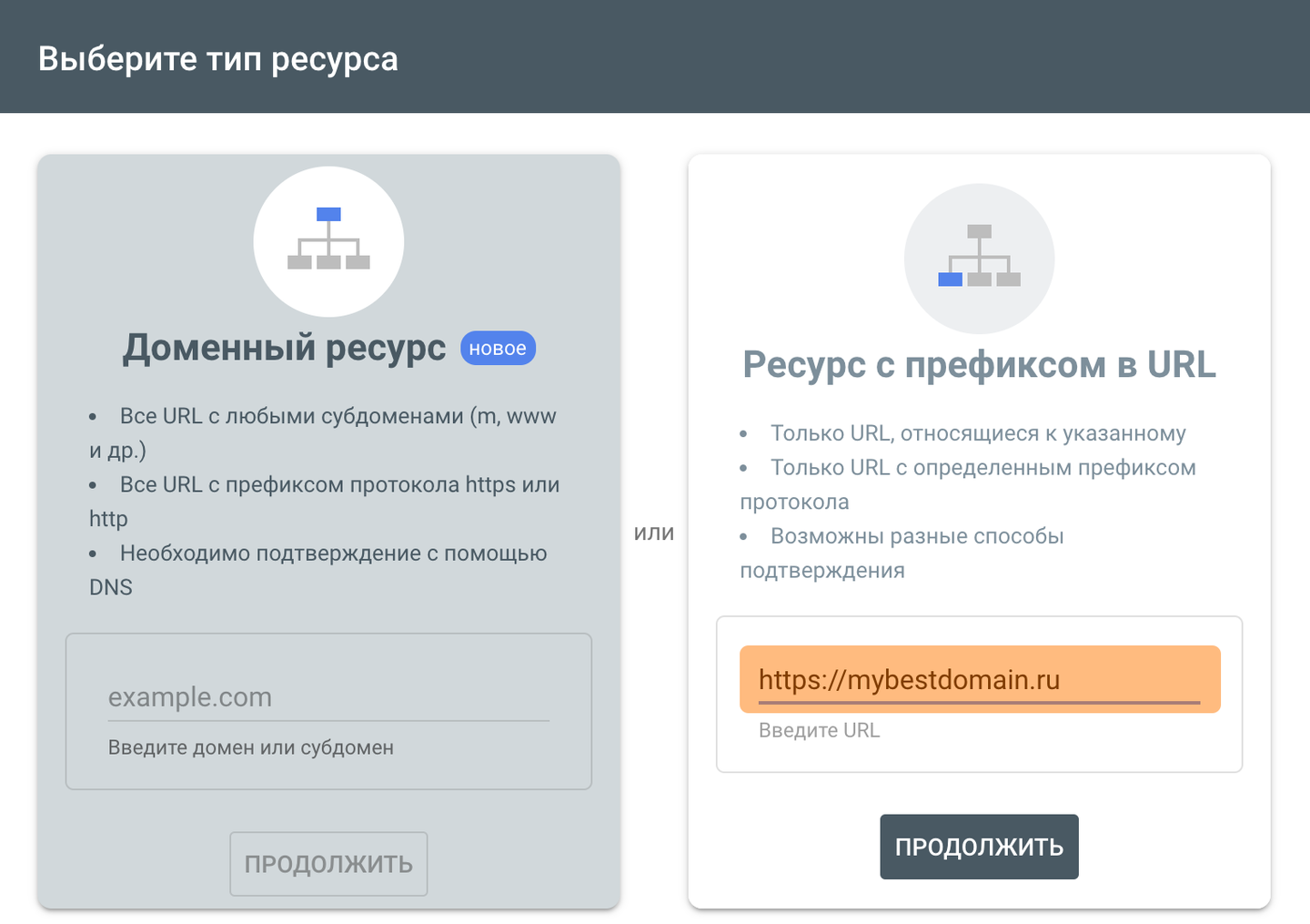 Введите адрес привязанного домена в разделе "Ресурс с префиксом в URL" и нажмите Продолжить.