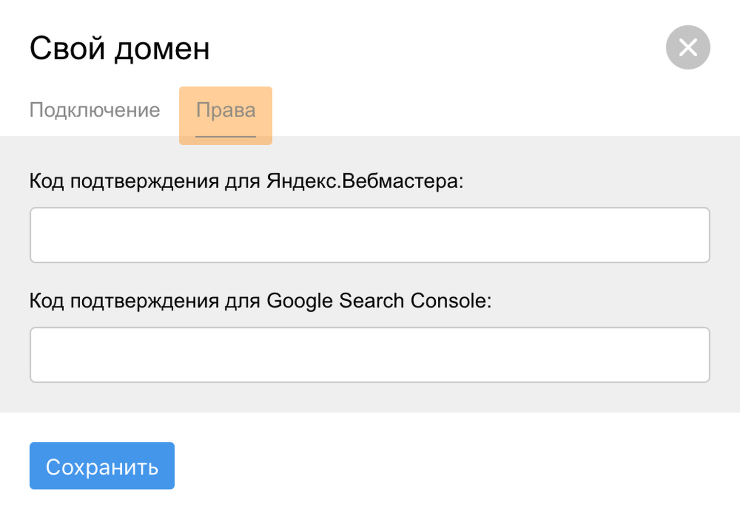 Откройте раздел Свой домен и перейдите во вкладку Права.