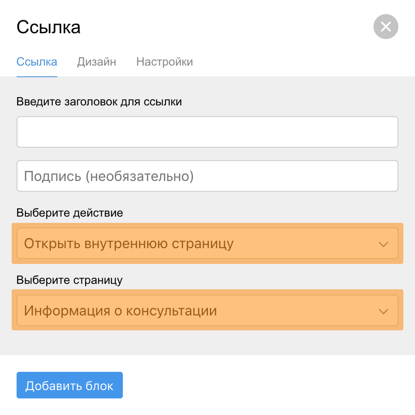 - Откройте выпадающий список и выберите пункт Создать внутреннюю страницу