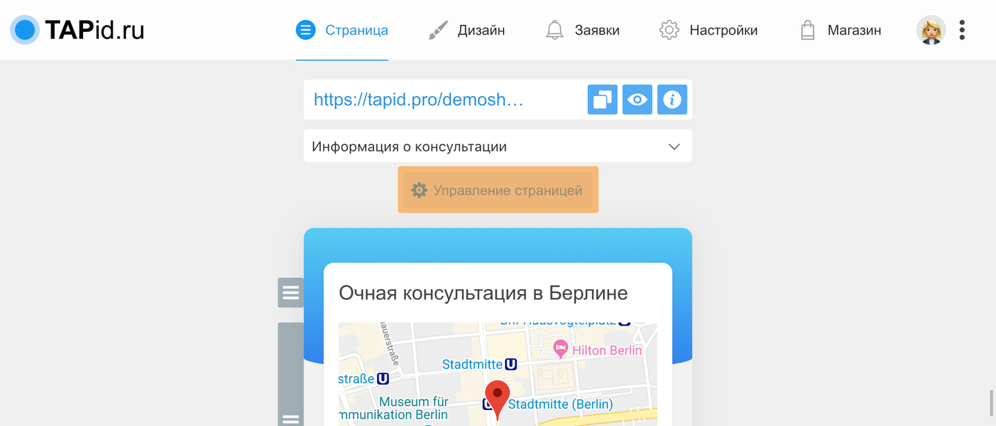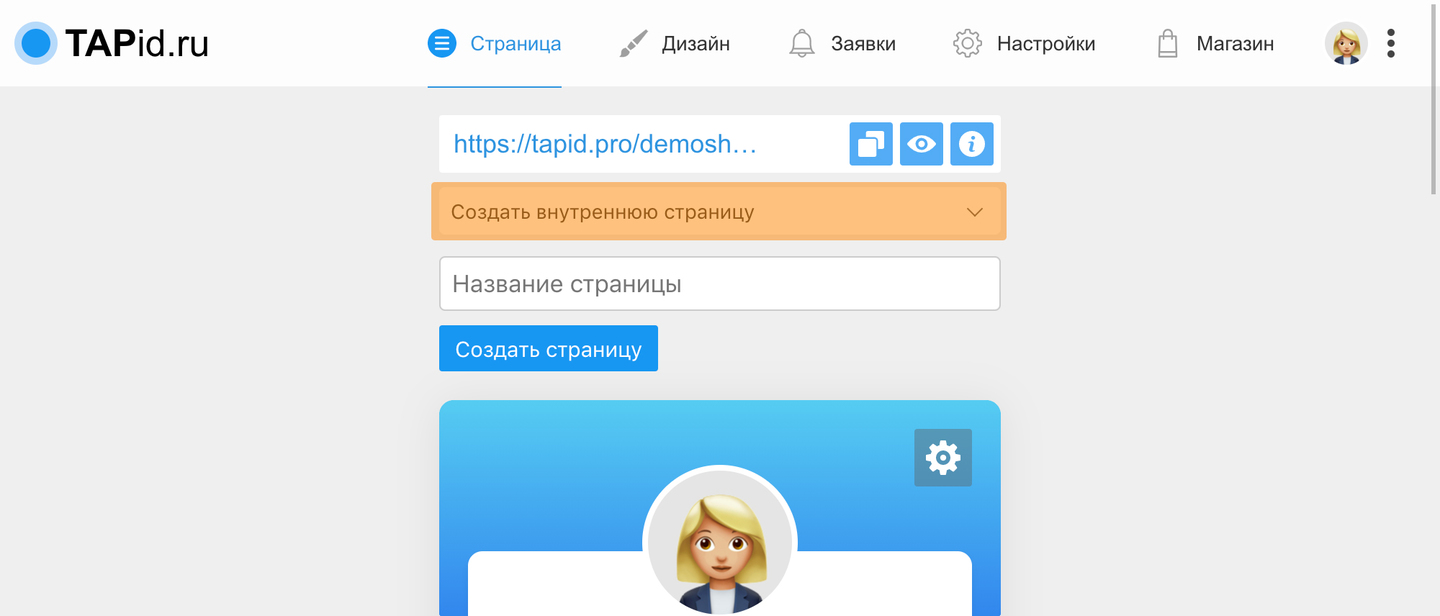 При переключении на внутреннюю страницу, станет доступна кнопка Управление страницей.