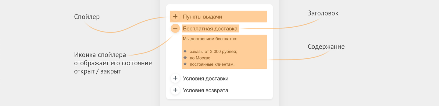 Блок Разворачивающийся список представляет собой набор спойлеров, — заголовок с плавным разворачиванием скрытой текстовой информации, при клике на заголовок.