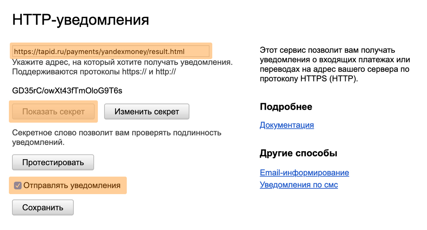 - Адрес для уведомлений укажите: https://tapid.ru/payments/yoomoney/result.html