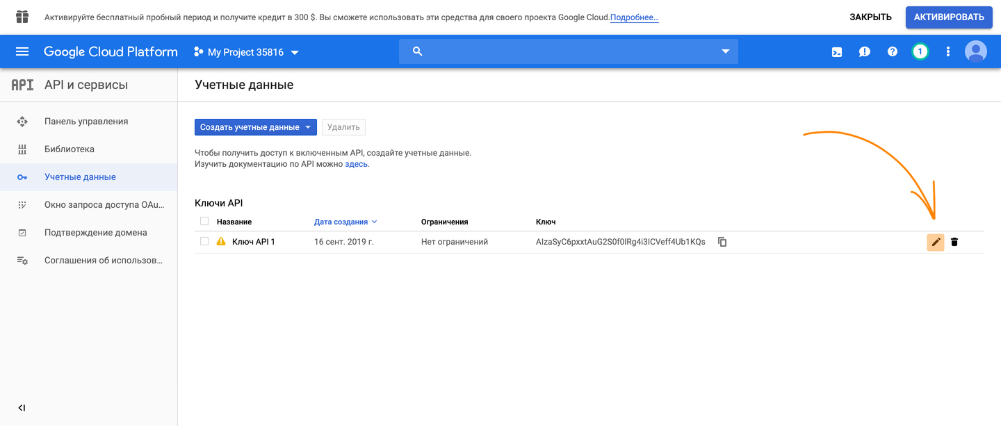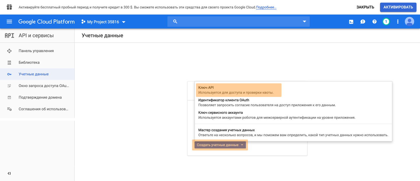 В новом окне нажмите Создать учетные данные и выберите из списка Ключ API