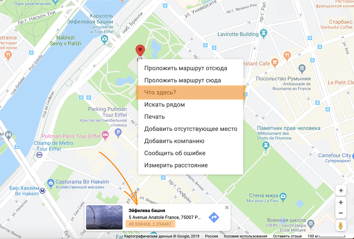 - Внизу окна появится информация с координатами объекта. До запятой - координаты широты (Y), после запятой - координаты долготы (X)