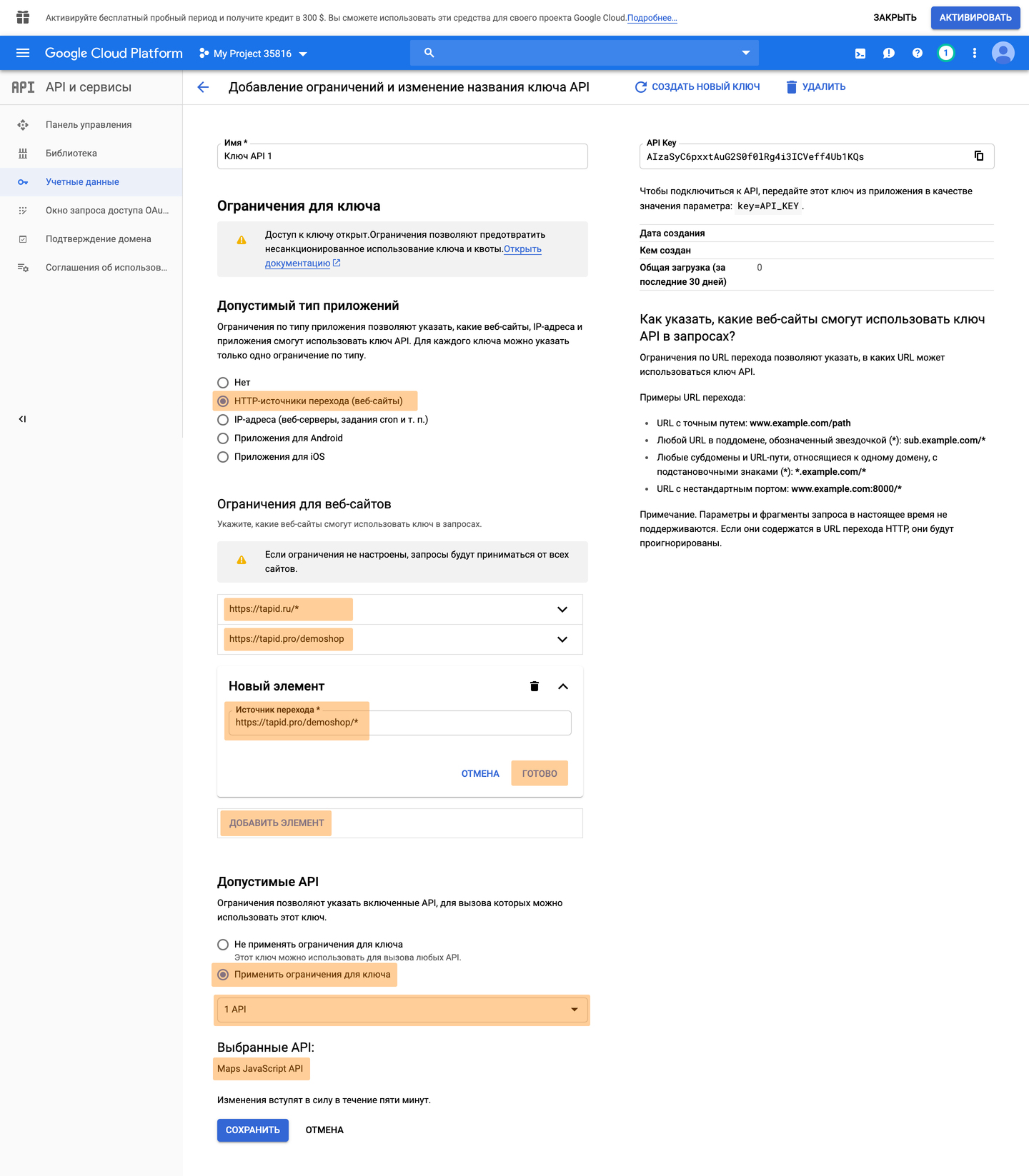 Указание URL адресов необходимо для того, чтобы карта отображалась в личном кабинете TAPid и на страницах вашего сайта. В противном случае, ваш ключ смогут использовать злоумышленники, расходуя лимит.